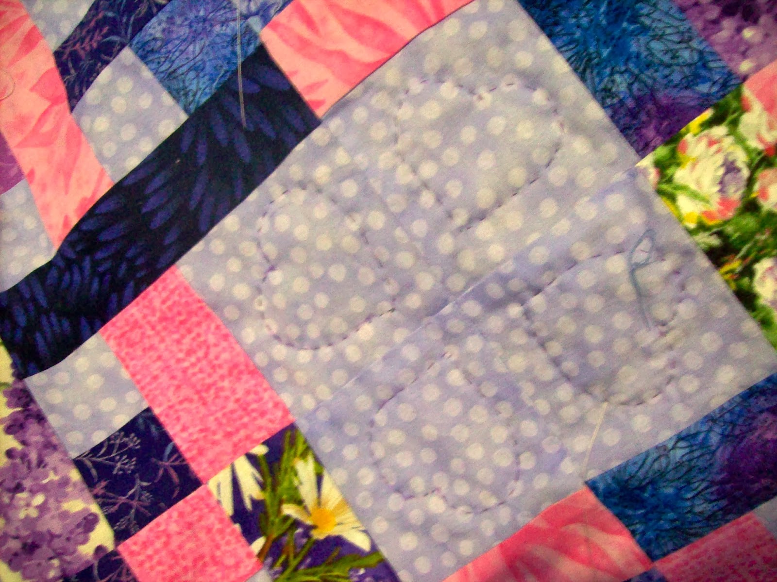 Here is a closeup of Baylee's GARDEN PATHS. The lavender doesn't photograph true to color with my camera in closeups, but it is stunning. I decided to hand quilt hearts on each of the blocks. I tested a couple of fabric pens with disappearing ink. One had to be washed out and bled, so it was not going to work for this. The other one is supposed to stay on for 48 hours but is gone with minutes! I drew on the 4 hearts and quilted with the speed of lightening. Well. The thread is just dark enough to show when you are close, and blends enough so that it isn't the focus of this stunning pattern and materials.